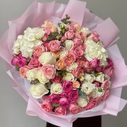 Тени в саду – Корзина с пионовидными розами, георгинами и дельфиниумом