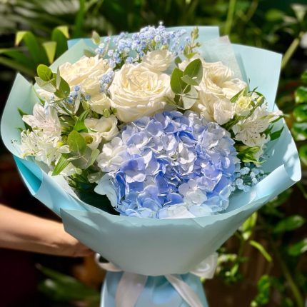 Авторский букет из голубой Гортензии, пионовидных Роз и Хризантемы Момоко