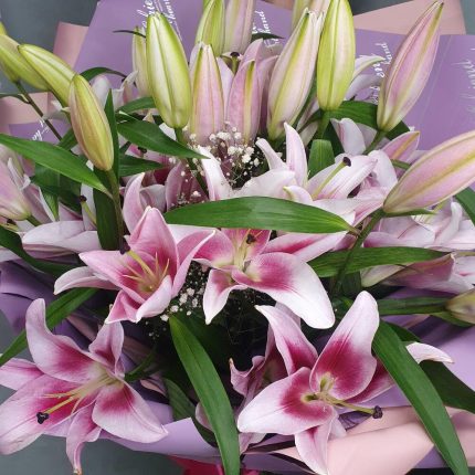 Корзина с лилией, белыми розами, альстромерией и декоративной зеленью «Весенний сад»