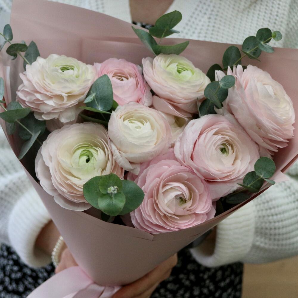 Букет розовых ранункулюсов и эвкалипта -