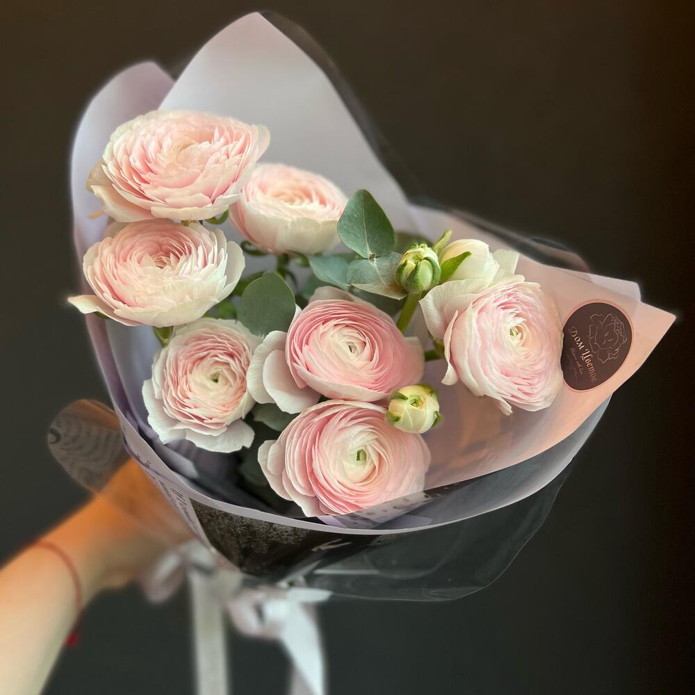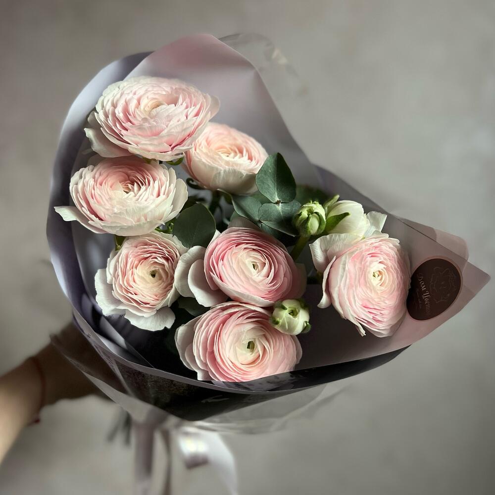 Ранункулюс – 7 шт.Эвкалипт – 3 шт.декоративная упаковка – 1 шт.Атласная лента – 1 шт.