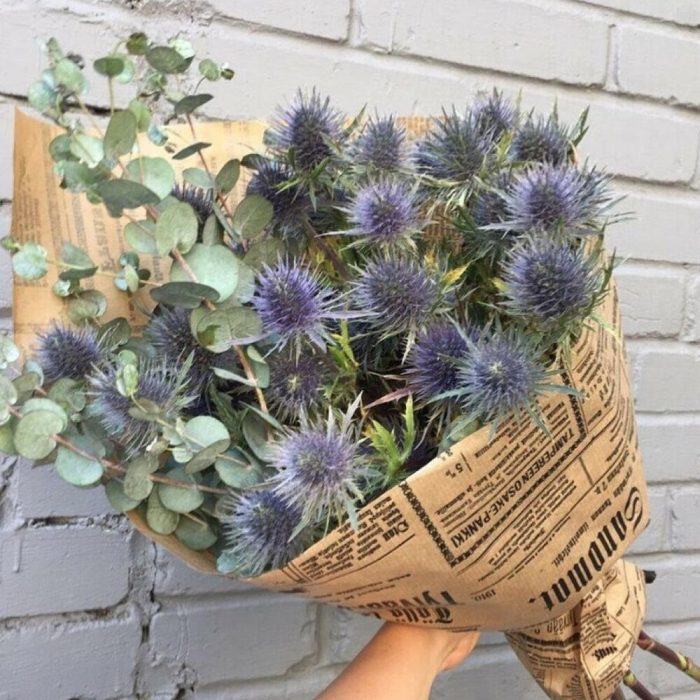 Эрингиум синий – 5 шт.ветки эвкалипта – 3 шт.Упаковка дизайнерская крафт – 2 шт.работа флориста – 1 шт.