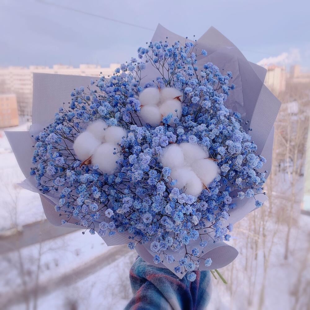 Лента атласная – 1 шт.Упаковка дизайнерская – 1 шт.Гипсофила голубая – 5 шт.хлопок белый – 3 шт.