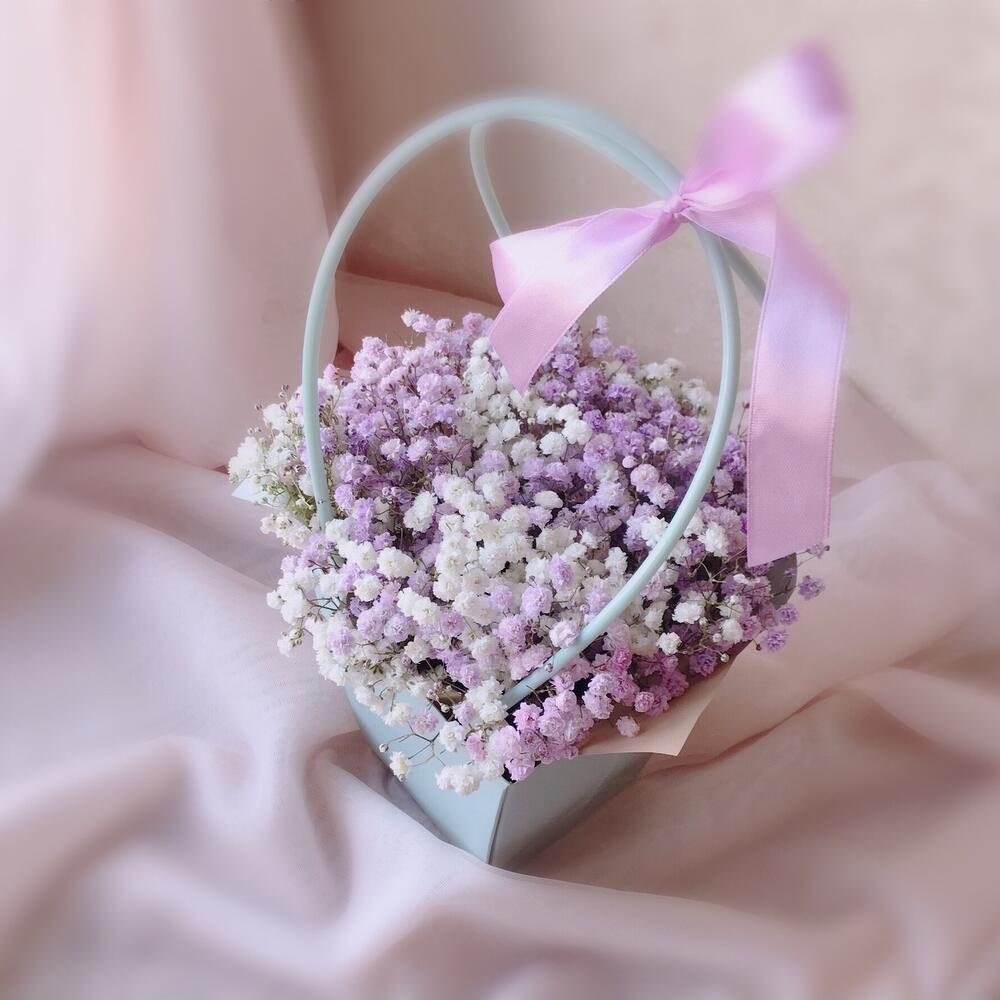 Лента атласная – 1 шт.Сумочка – 1 шт.Флористическая губка – 1 шт.Гипсофила фиолетовая – 3 шт.гипсофила белая – 2 шт.