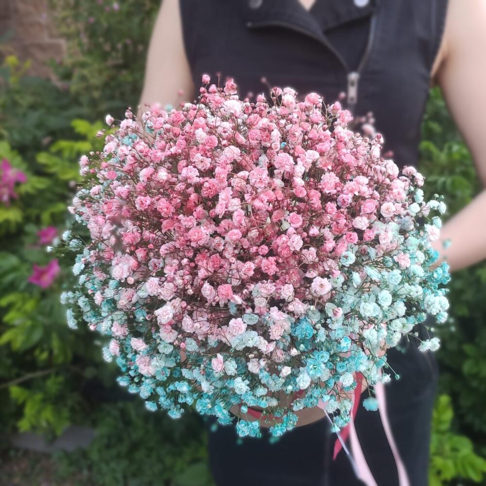 гипсофила микс – 8 шт.Шляпная коробка – 1 шт.Оазис флористический – 1 шт.