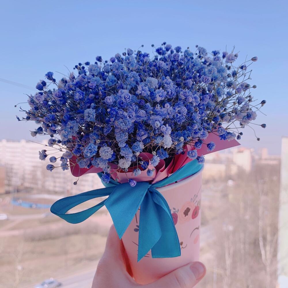 Флористическая губка – 1 шт.Инструкция по уходу – 1 шт.голубая гипсофила – 3 шт.бумажный Стакан – 1 шт.