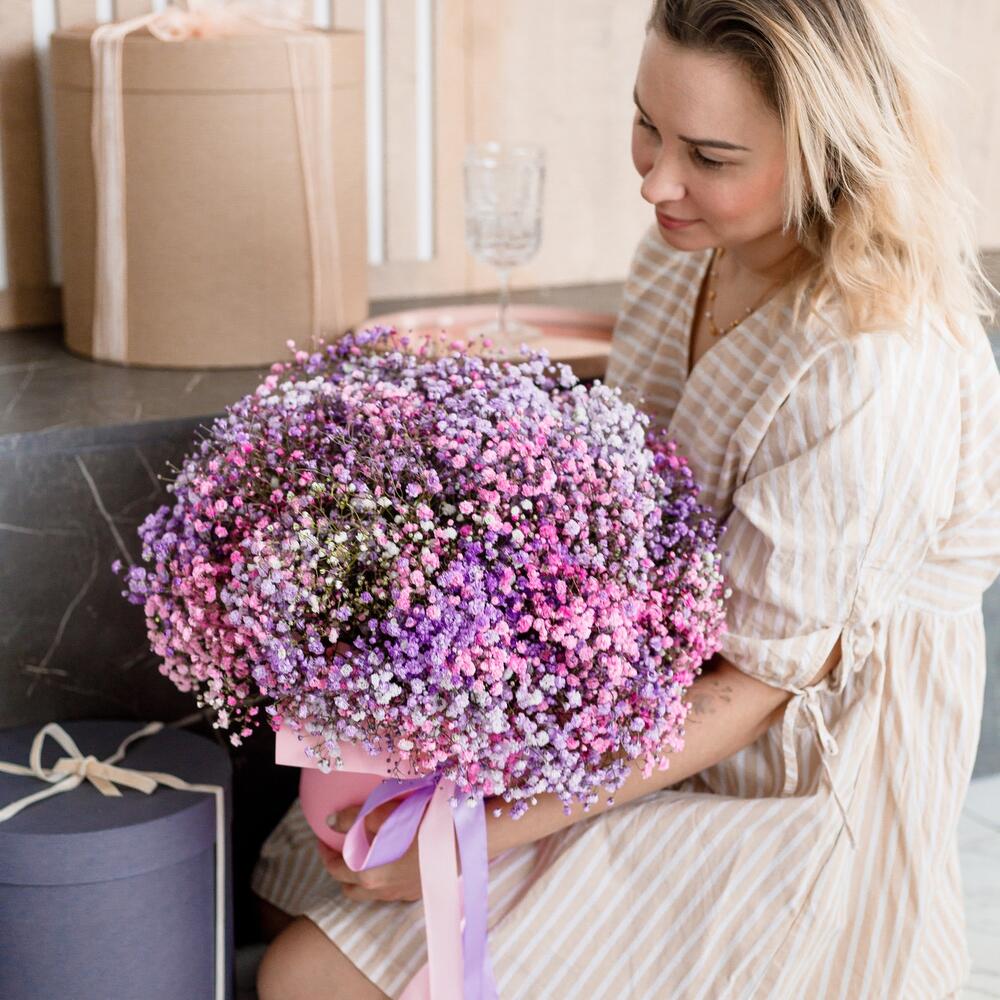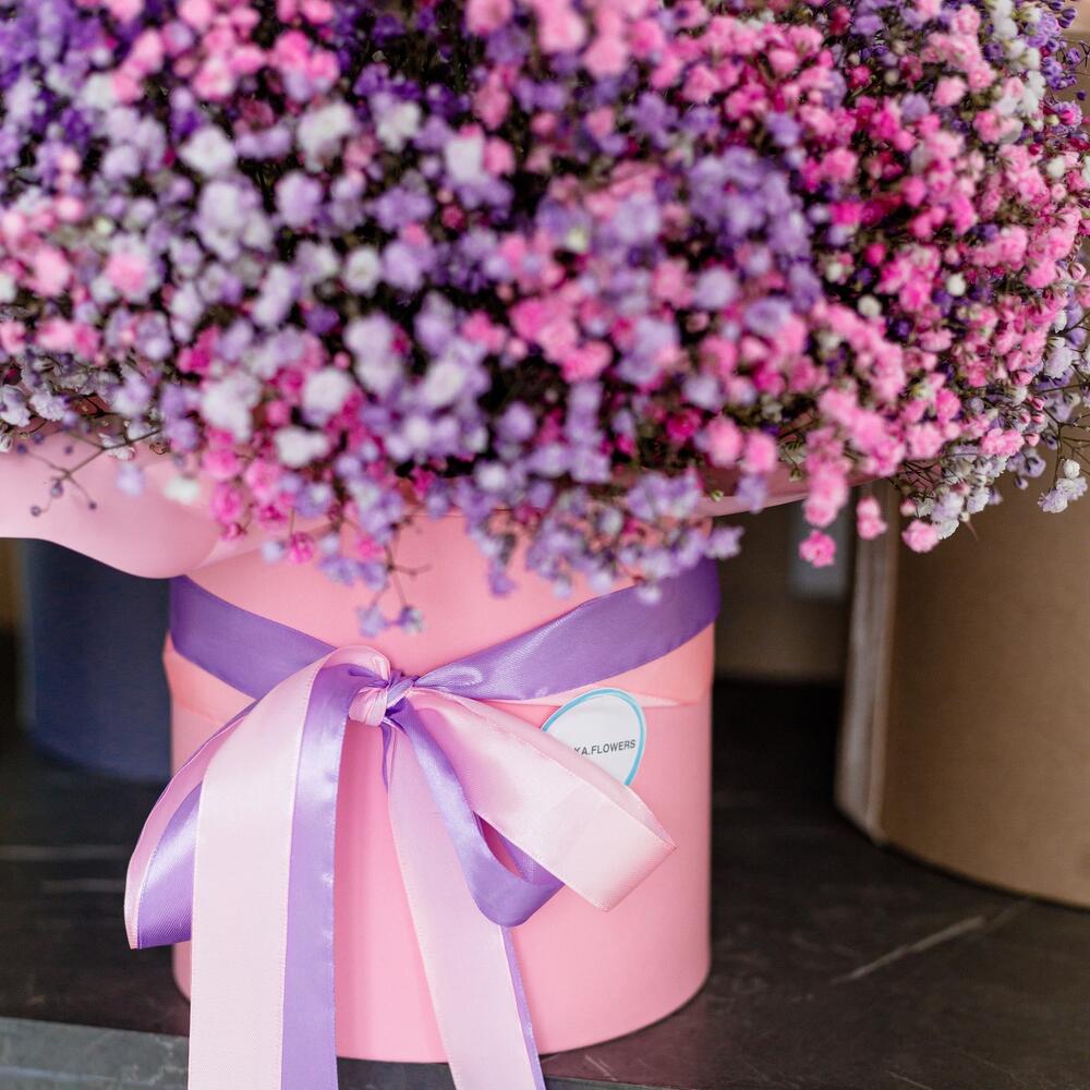 Гипсофила – 15 шт.Оазис флористический – 3 шт.Коробка шляпная – 1 шт.Лента атласная – 2 шт.Корейская пленка – 1 шт.