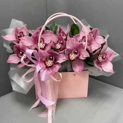 Орхидея Цимбидиум розовая – 9 шт.Хиперикум красный – 5 шт.гипсофила белая – 2 шт.фисташка зелень – 15 шт.Упаковка дизайнерская – 3 шт.