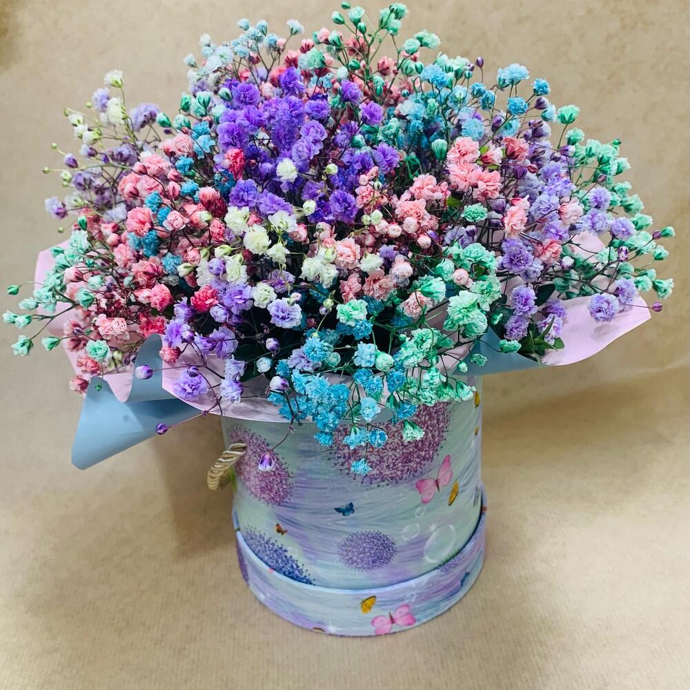 “Сиреневый туман” – композиция из гипсофилы в шляпной коробке