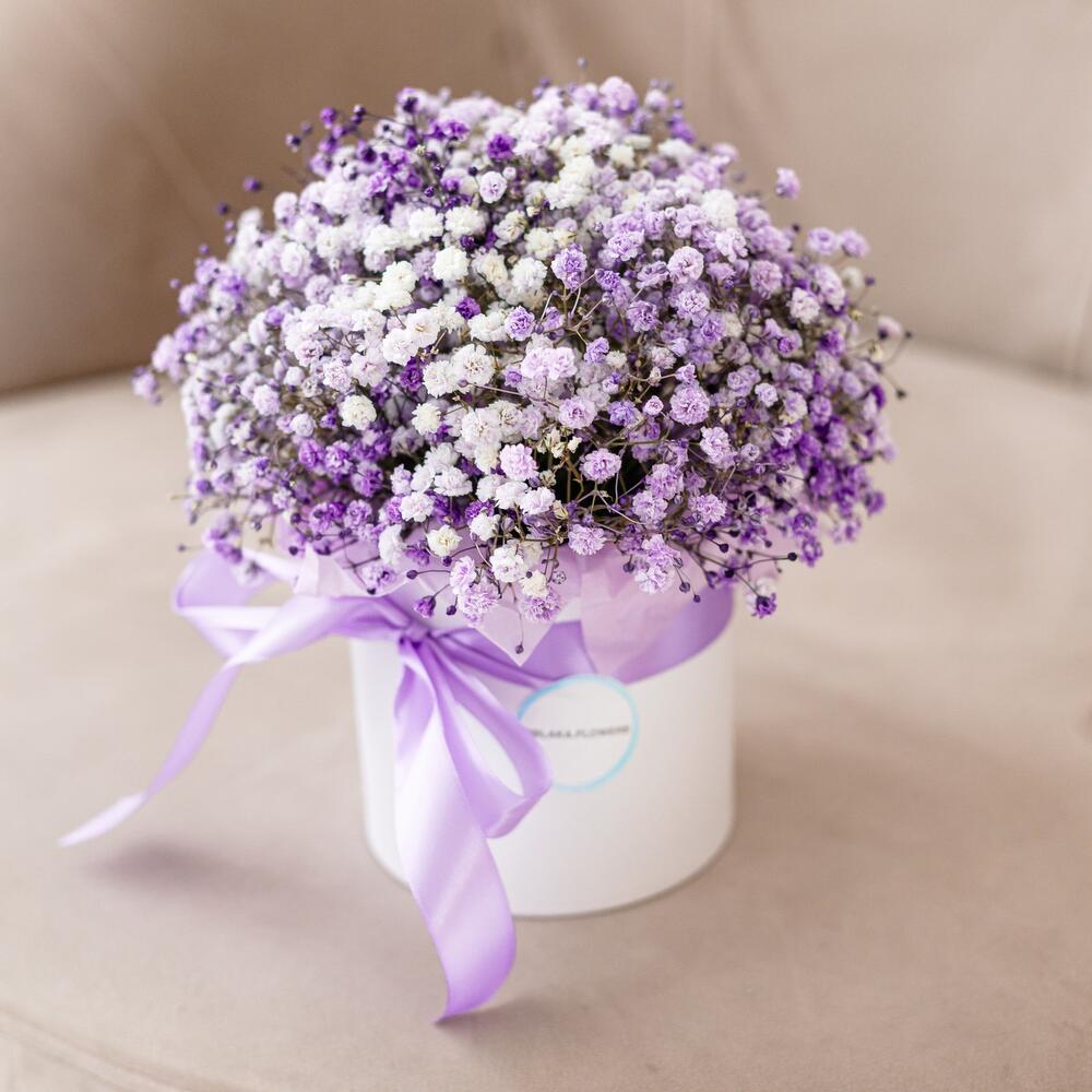 “Сиреневый туман” – композиция из гипсофилы в шляпной коробке