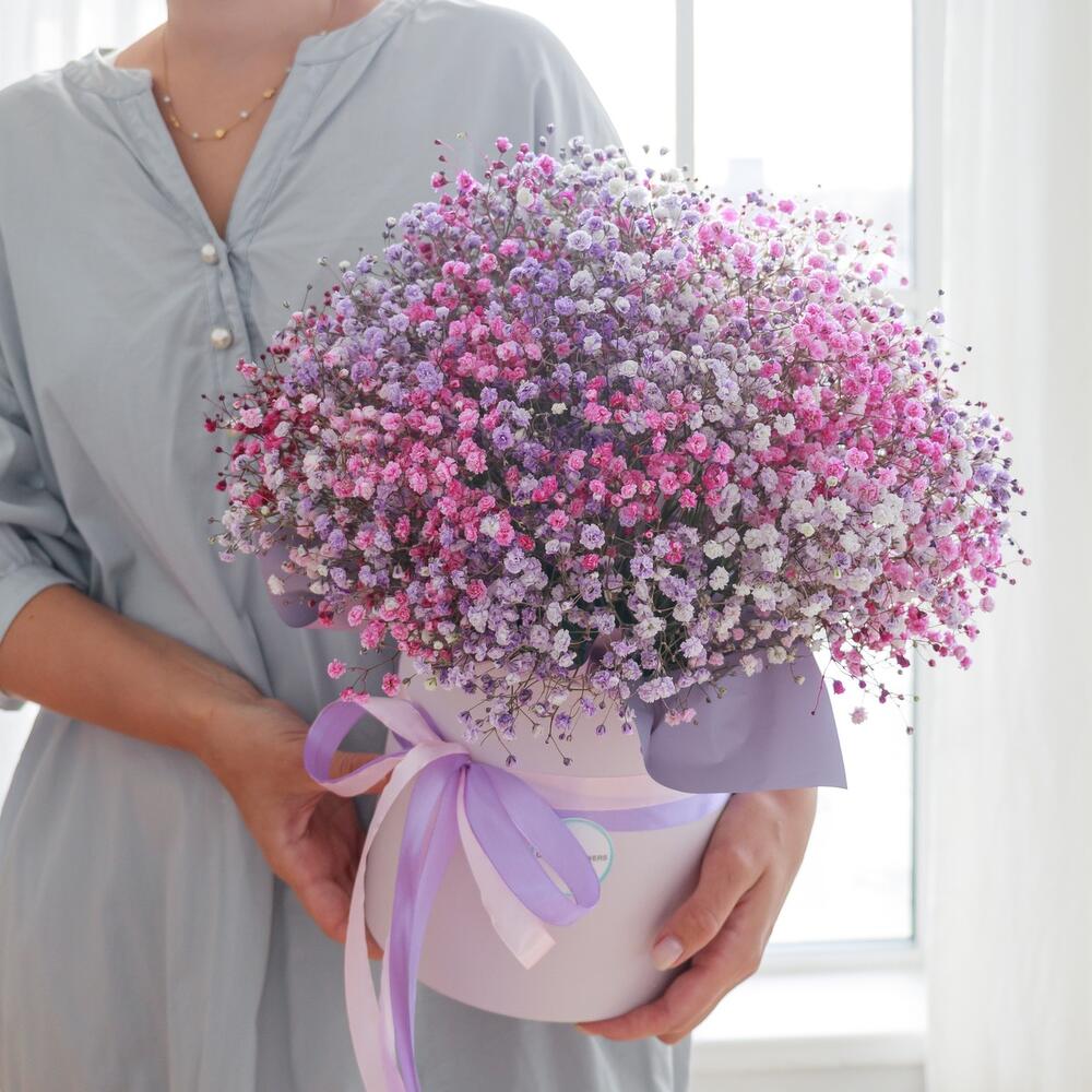 гипсофила цветная – 9 шт.Коробка шляпная – 1 шт.Лента атласная – 2 шт.упаковка пленка корейская – 1 шт.Флористическая губка – 3 шт.