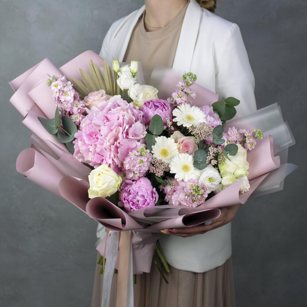 пионы сара бернардт – 3 шт.Гортензия розовая – 1 шт.гермини белые – 3 шт.маттиола персиковая – 5 шт.розы стандартные – 5 шт.Озотамнус – 2 шт.сушеная пальма – 1 шт.