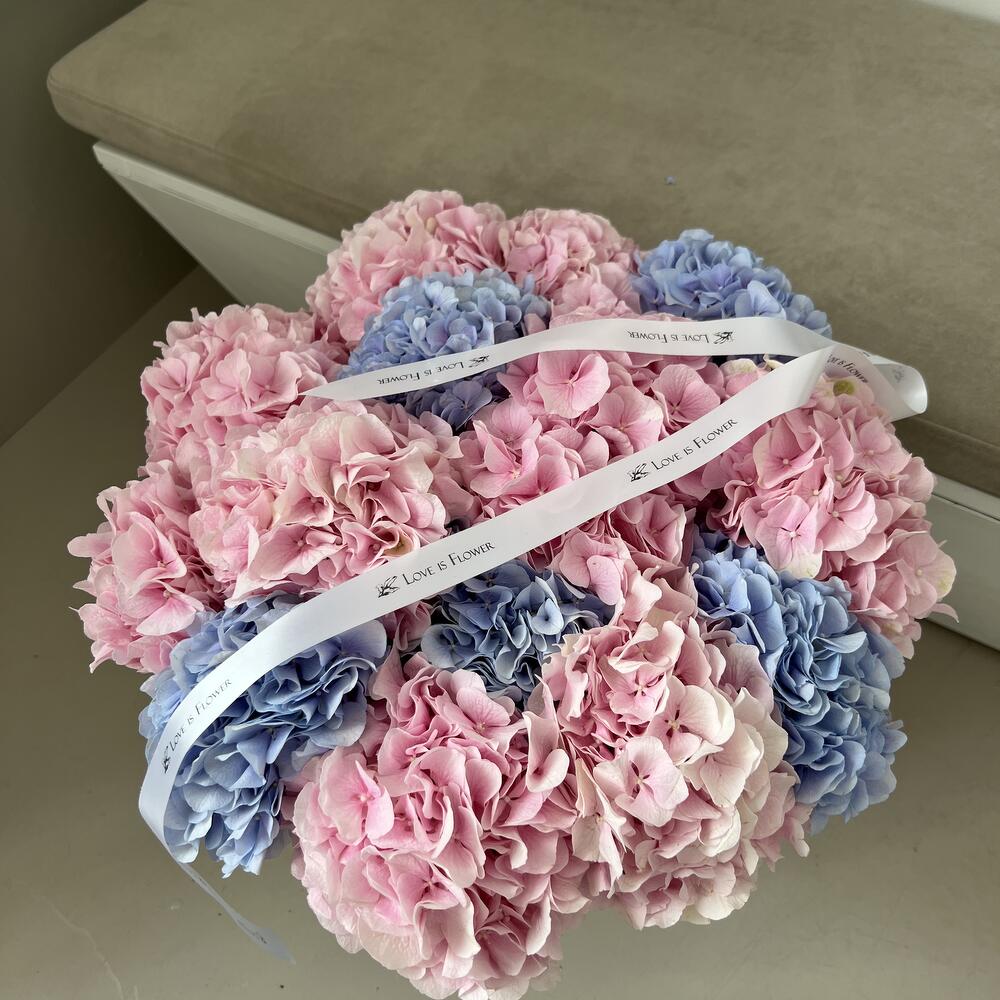 открытка брендированная в подарок – 1 шт.гортензия голландия нежно розовая – 10 шт.гортензия голландия лилово голубая – 5 шт.
