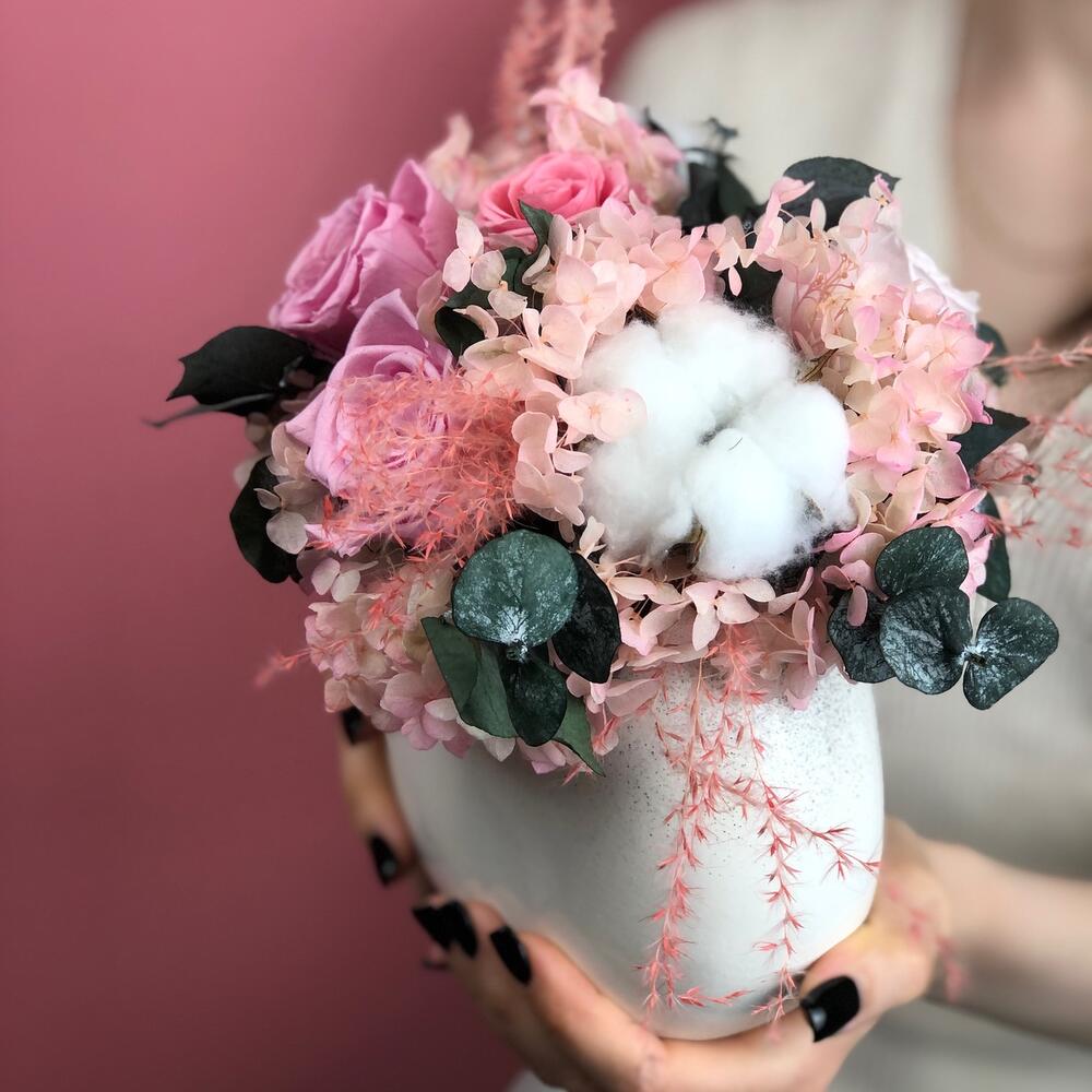 Композиция авторская из стабилизированых цветов. Ваза керамическая.Не требует ухода и полива, срок жизни 5-7 лет при соблюдении рекомендаций.