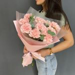 Эвкалипт – 1 шт.Атласная лента – 1 шт.Диантус сортовой – 11 шт.Дизайнерская упаковка – 1 шт.