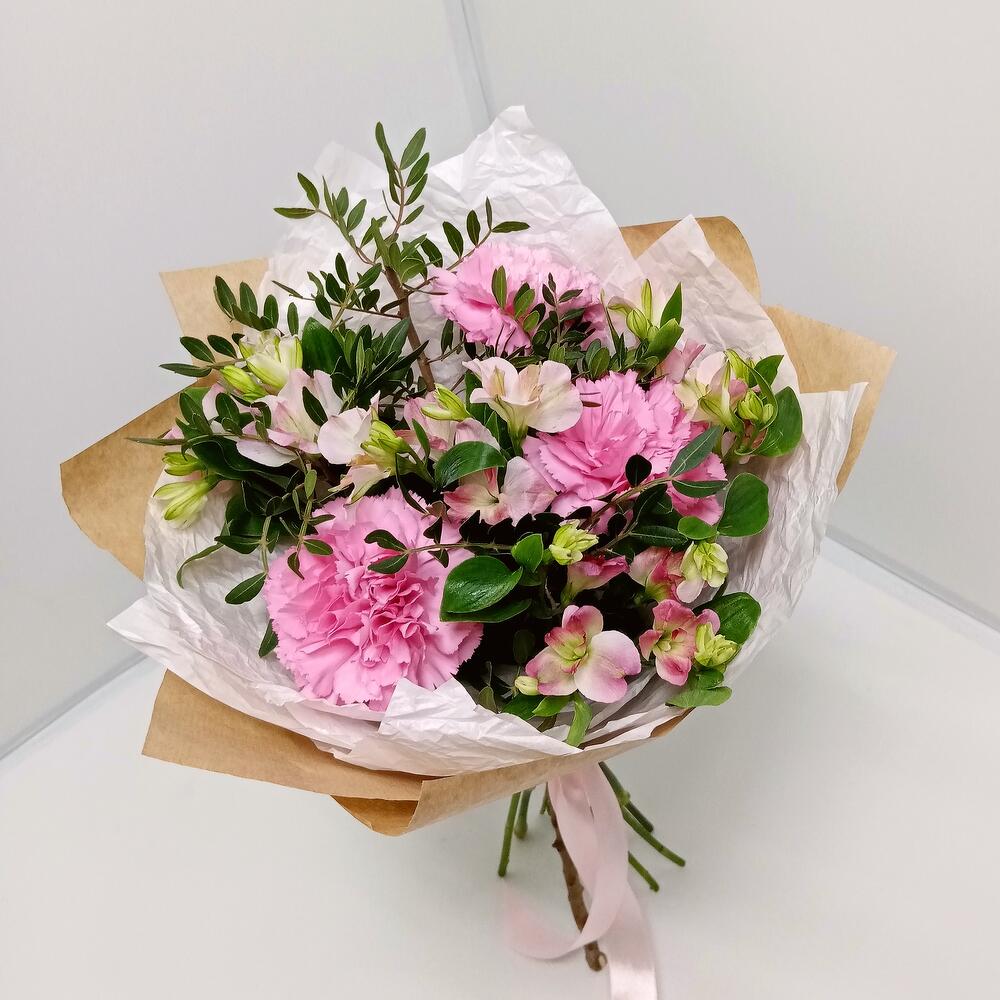 Альстромерия – 4 шт.Фисташка – 2 шт.Дизайнерская упаковка – 1 шт.диантусы – 3 шт.