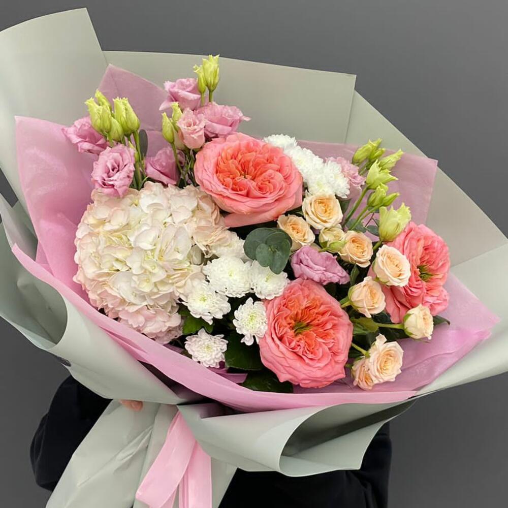 Альстромерии, Гвоздики, Кустовые розы, Лизиантусы, Розы, Хризантемы