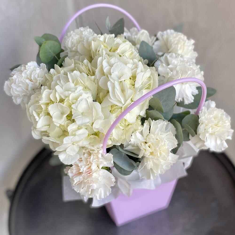 Гортензия – 1 шт.Эвкалипт – 5 шт.Сумка картон – 4 шт.Тишью – 1 шт.Диантус белый – 8 шт.Оазис флористический – 1 шт.