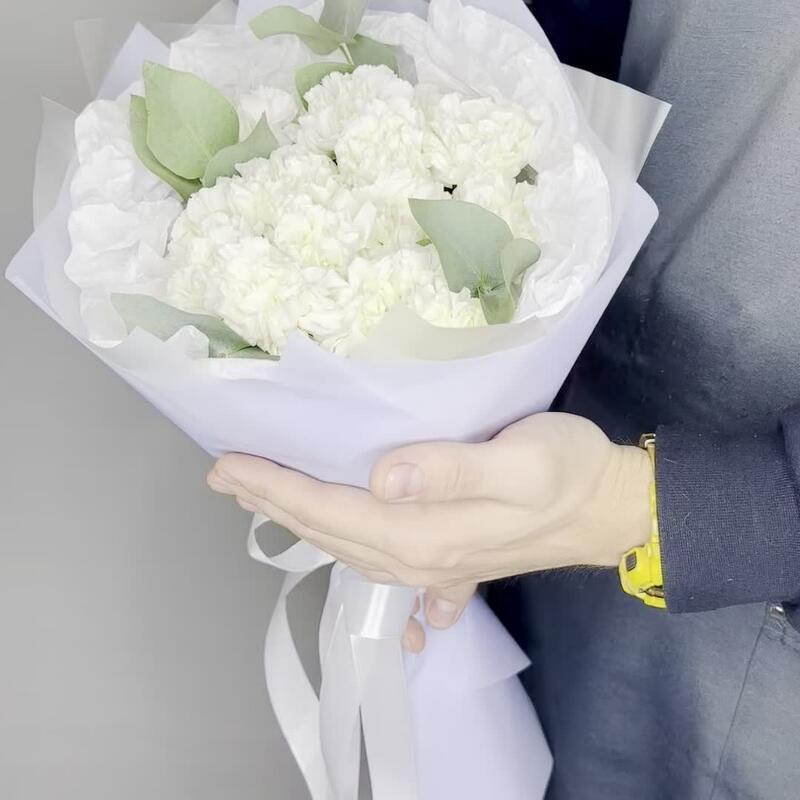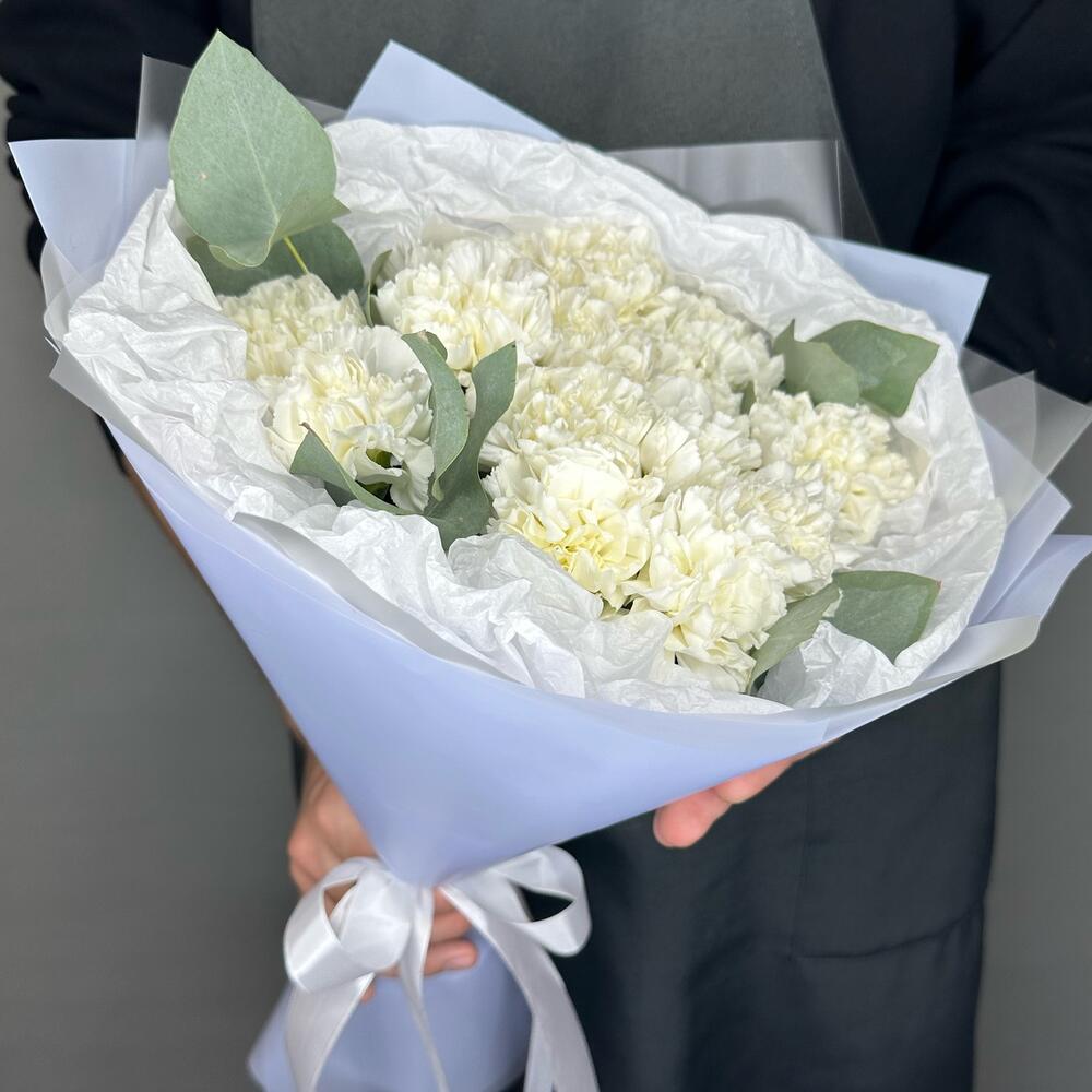 Монобукет из 15 белоснежных диантусов и ароматного эвкалипта "Океанический бриз"