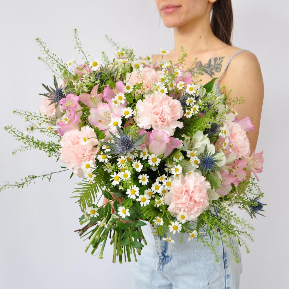 Ароматный букет с ромашками, колокольчиками и гвоздиками.Прелестные стойкие цветы слились в великолепном вальсе с голубыми колючками эрингиума, создавая непередаваемую атмосферу свободы, расслабления и счастья!Букет в европейском стиле, собран для вручения без упаковки!Будет красиво смотреться в вазе – круглый и нарядный со всех сторон!Истинная красота цветов для вашей ненаглядной.Доставим на воде и коробке, бережно и с заботой)