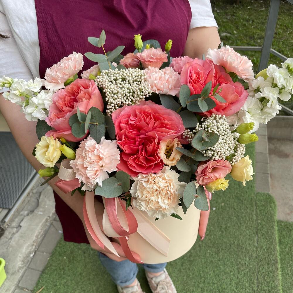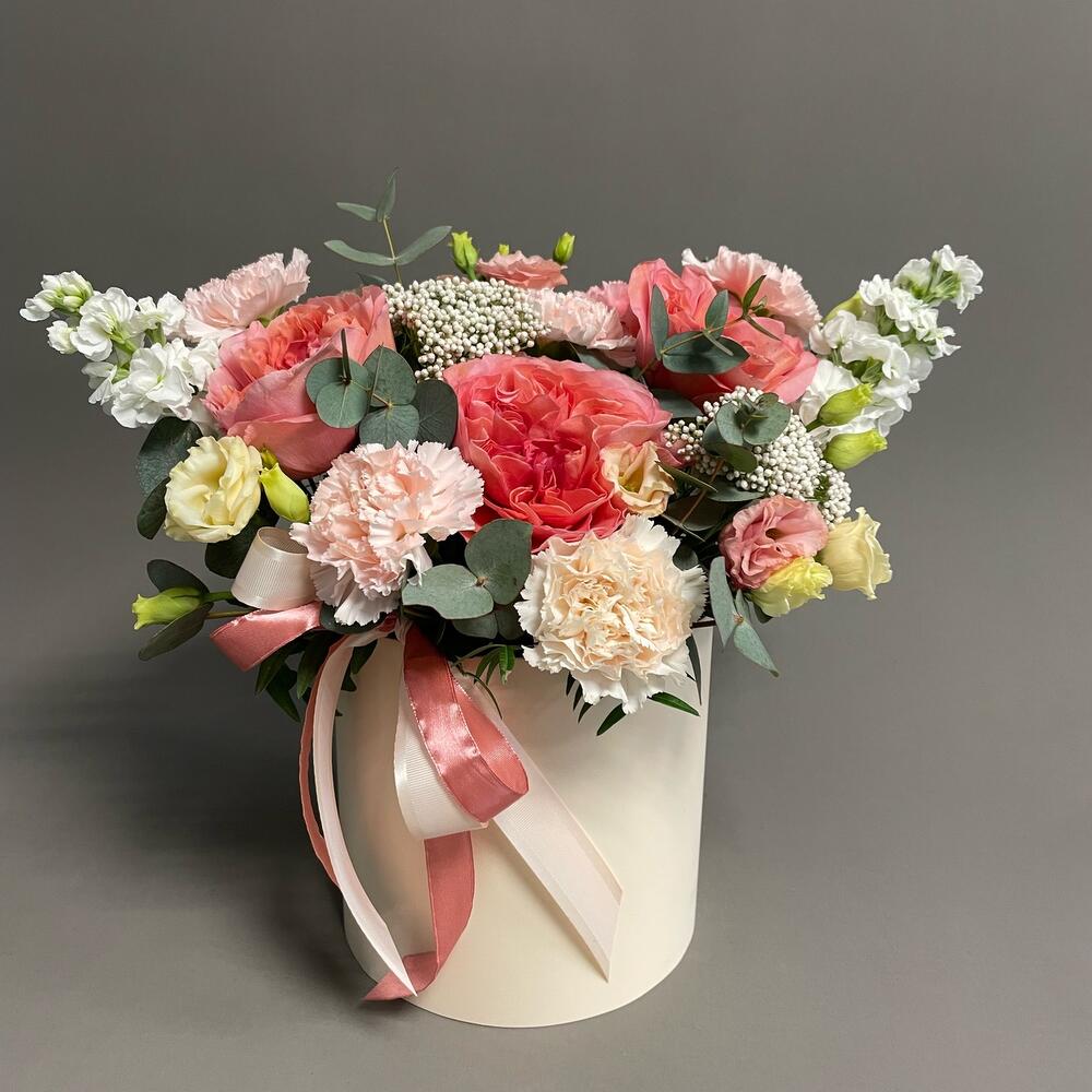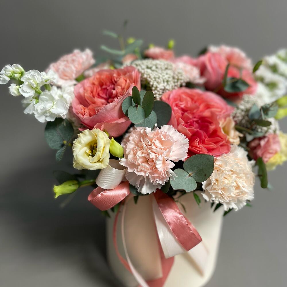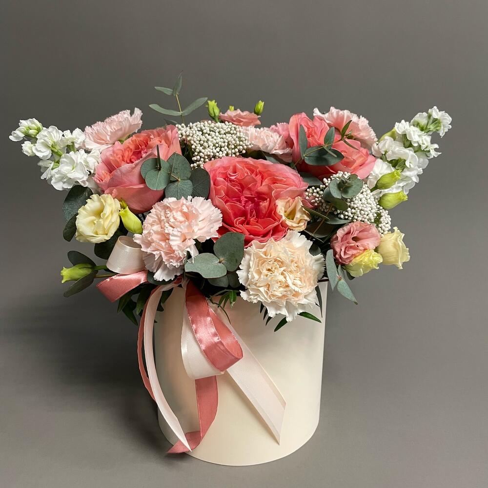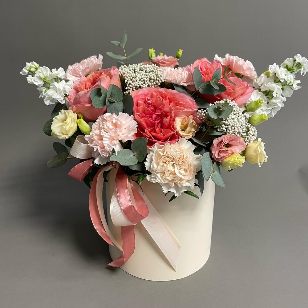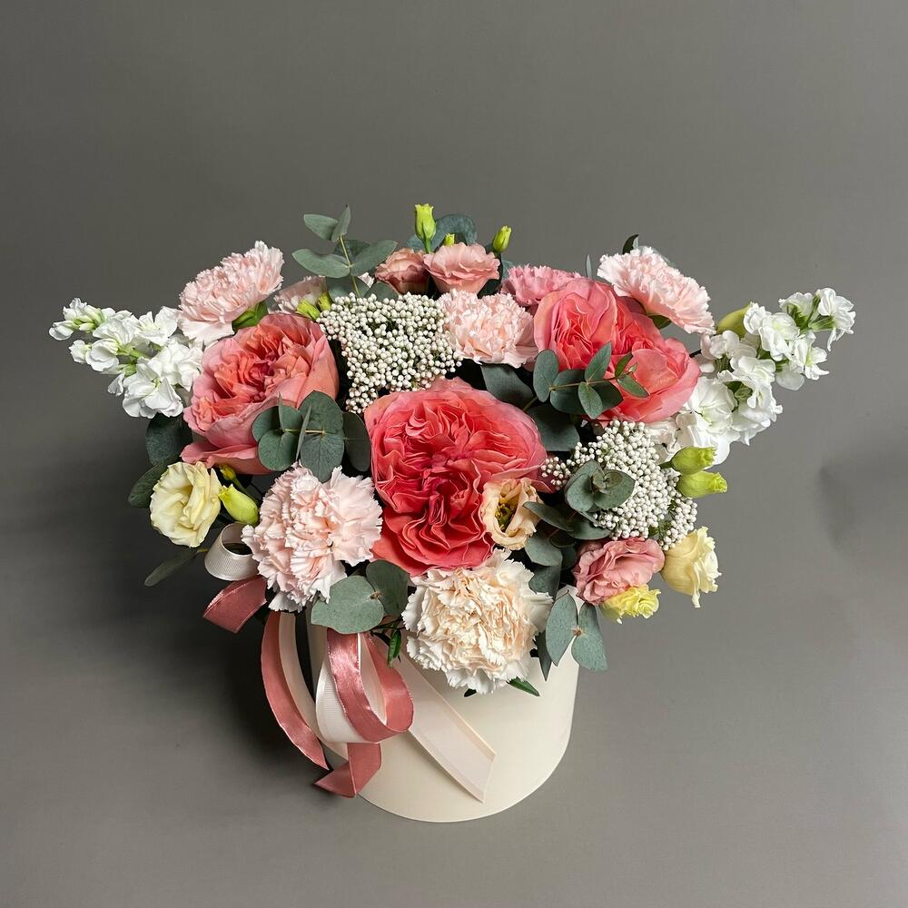 Большая эффектная цветочная коробка с яркими пионовидными розами и нежными гвоздиками. Белая Матиола – красивый акцент.Роскошный подарок.