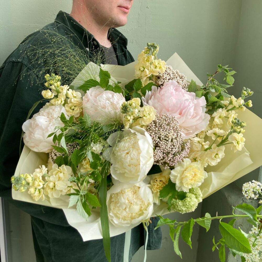 Пион – 5 шт.Паникум – 3 шт.Маттиола – 6 шт.Гвоздика – 3 шт.Озотамнус – 3 шт.Ветки малины – 3 шт.Упаковка – 1 шт.