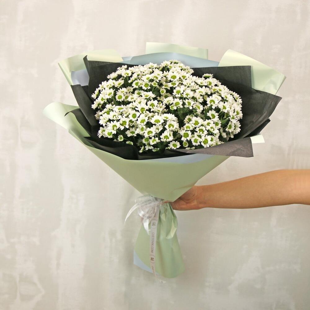 Букет из 15 белых кустовых хризантем Сантини в стильной упаковке