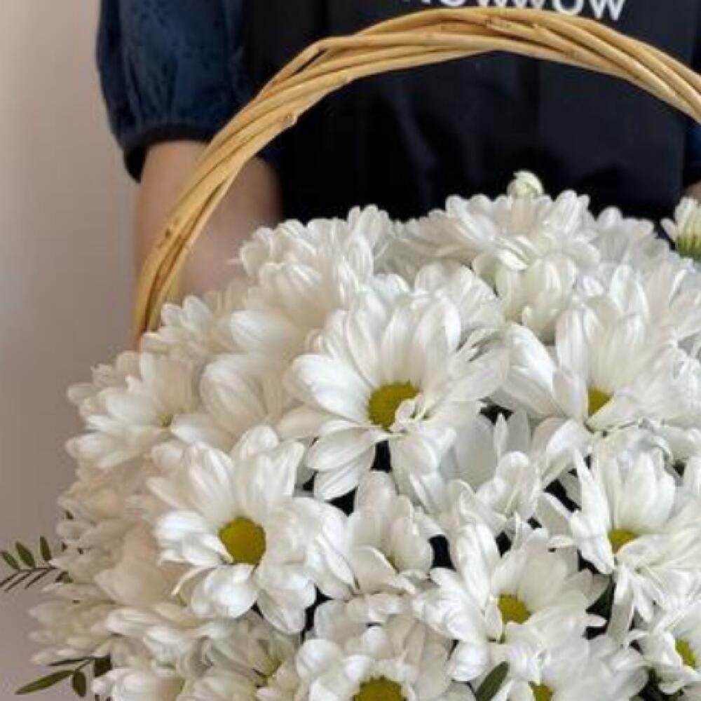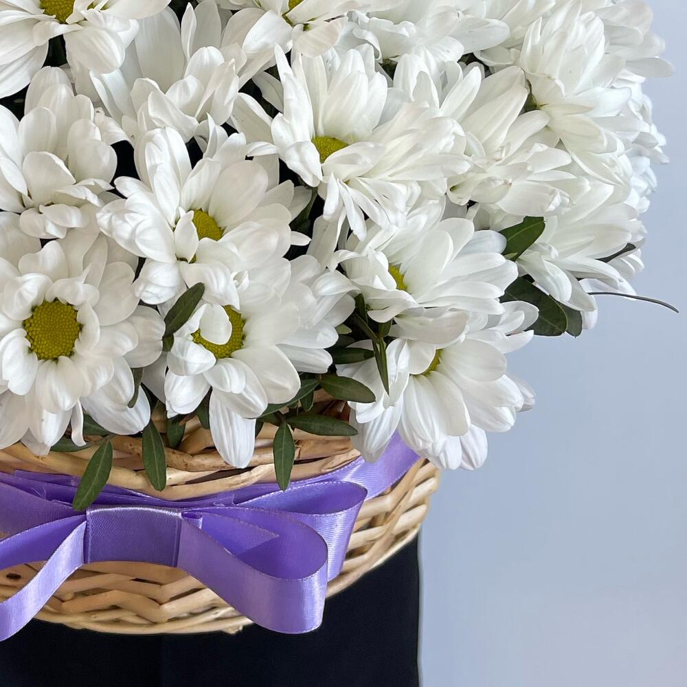 Хризантема кустовая – 9 шт.Фисташка – 3 шт.Корзина плетеная – 1 шт.бант атласный – 1 шт.