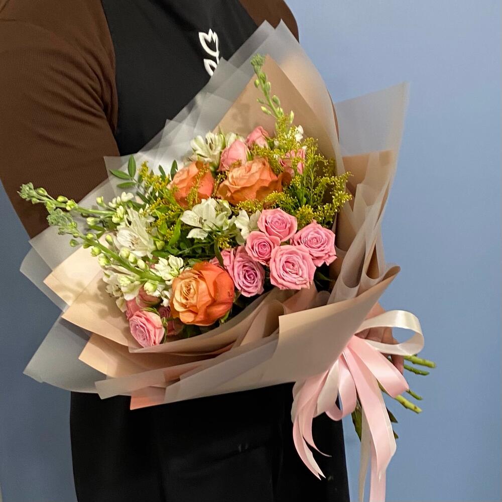 Альстромерия – 3 шт.Солидаго – 2 шт.Кустовая роза – 3 шт.Лента атласная – 2 шт.Фисташка – 3 шт.Упаковка дизайнерская – 2 шт.Маттиола белая – 3 шт.пионовидная роза премиум – 3 шт.