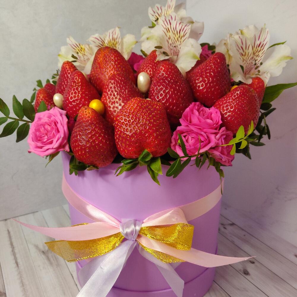 Альстромерия – 4 шт.Клубника – 800 гр.Кустовая роза – 5 шт.Шляпная коробка – 1 шт.Фисташка пучок – 3 шт.