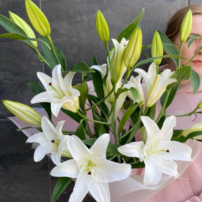 Лента атласная – 1 шт.Лилия белая – 3 шт.Упаковка дизайнерская – 4 шт.