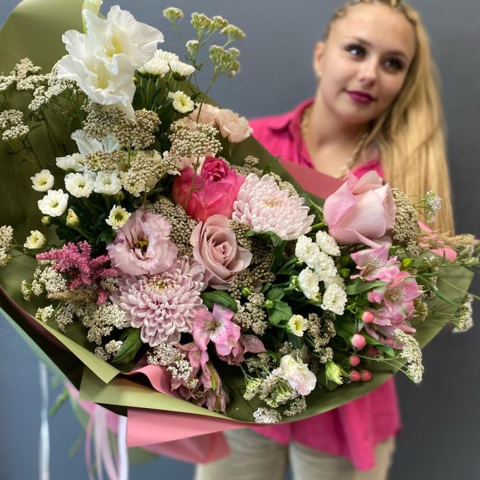 Альстромерия – 2 шт.Астильба – 1 шт.Гиперикум – 2 шт.Роза – 2 шт.Зелень – 3 шт.Упаковка – 2 шт.Эустома – 2 шт.Лента атласная – 2 шт.Сантини – 2 шт.Гладиолус – 1 шт.Тысячелистник – 5 шт.кантри блю – 1 шт.россана – 2 шт.