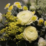 Ромашка кустовая – 2 шт.Мимоза – 1 шт.Краспедия – 3 шт.Ранункулюс – 2 шт.Амми – 2 шт.Лизиантус – 3 шт.Эвкалипт – 5 шт.Лента – 1 шт.