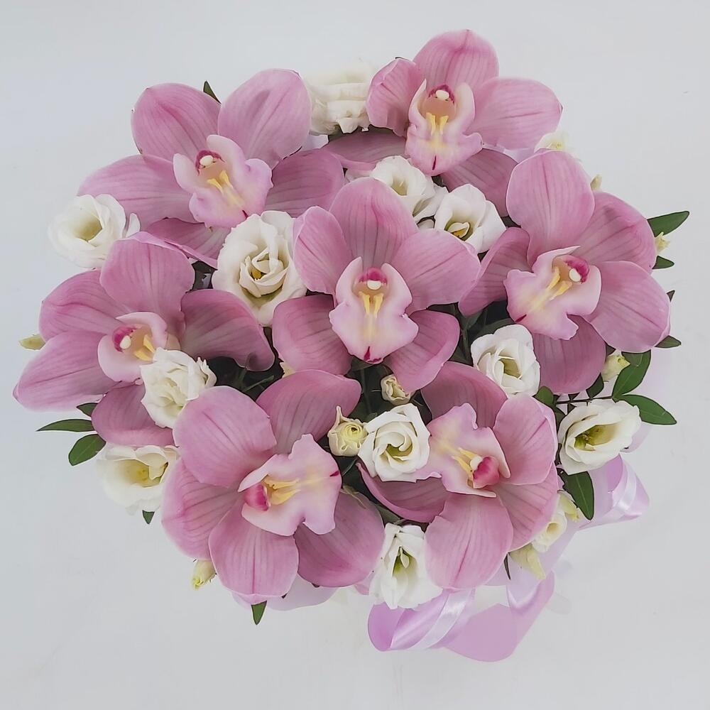 Орхидея цимбидиум бутон – 7 шт.Эустома – 3 шт.Пистация – 3 шт.Коробка цилиндр – 1 шт.Пленка матовая – 1 шт.Лента атласная – 1 шт.Флористическая губка (оазис) – 1 шт.