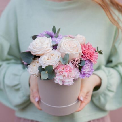 Роза Эквадор – 3 шт.Альстромерия – 3 шт.Ваксфлауэр – 1 шт.Лизиантус – 2 шт.Шляпная коробка – 1 шт.Фисташка – 1 шт.Лента атласная – 1 шт.Корейская пленка – 1 шт.Оазис – 1 шт.