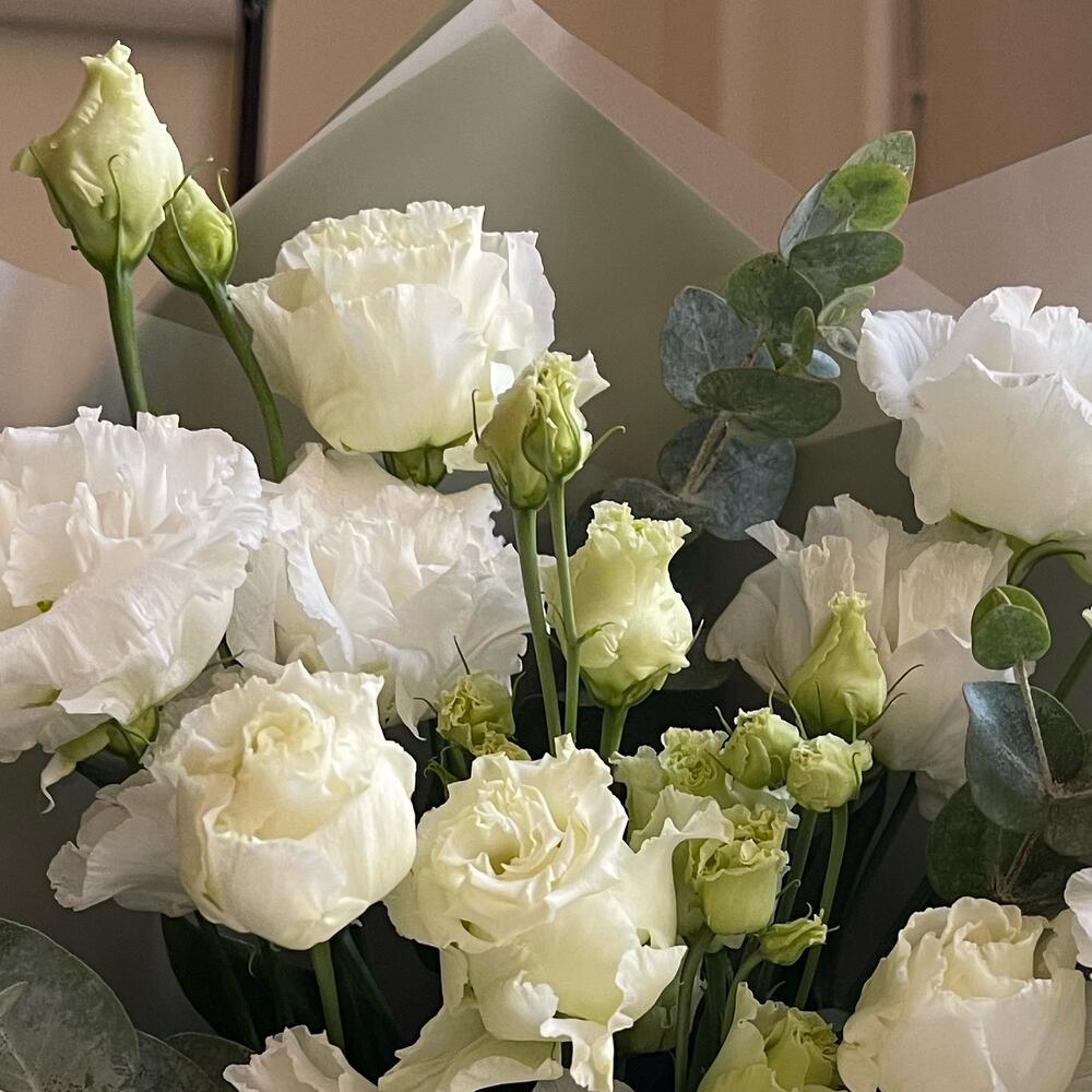 Лизиантус – 3 шт.Эвкалипт – 2 шт.Упаковка дизайнерская – 2 шт.Лента атласная – 2 шт.
