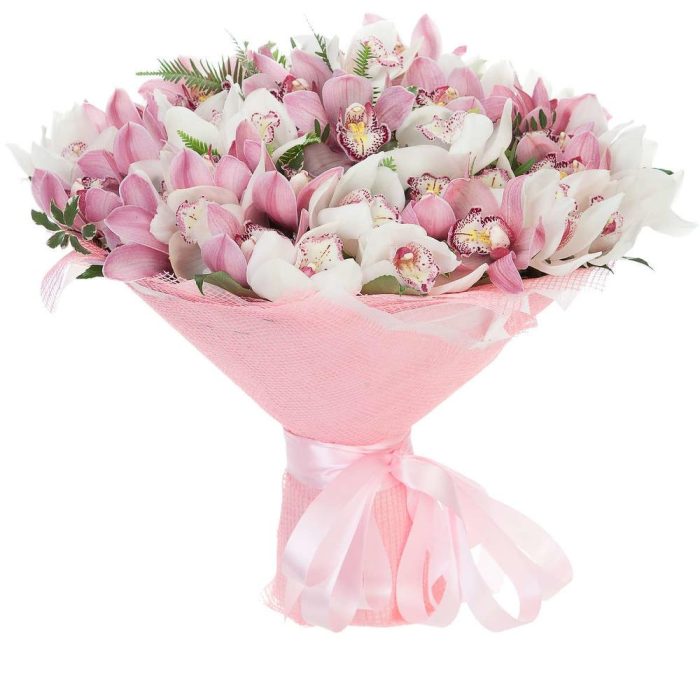 Орхидея Цимбидиум – 19 шт.Упаковка дизайнерская – 1 шт.зелень декоративная – 15 шт.