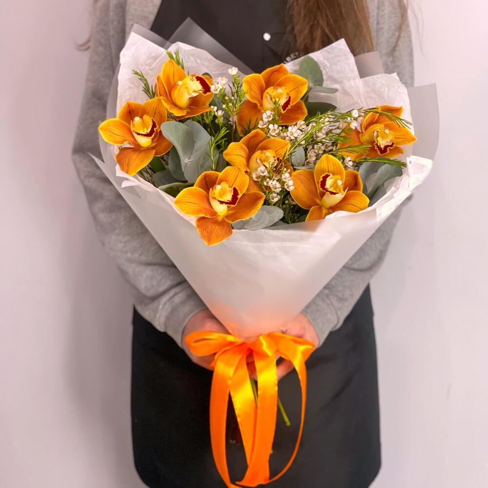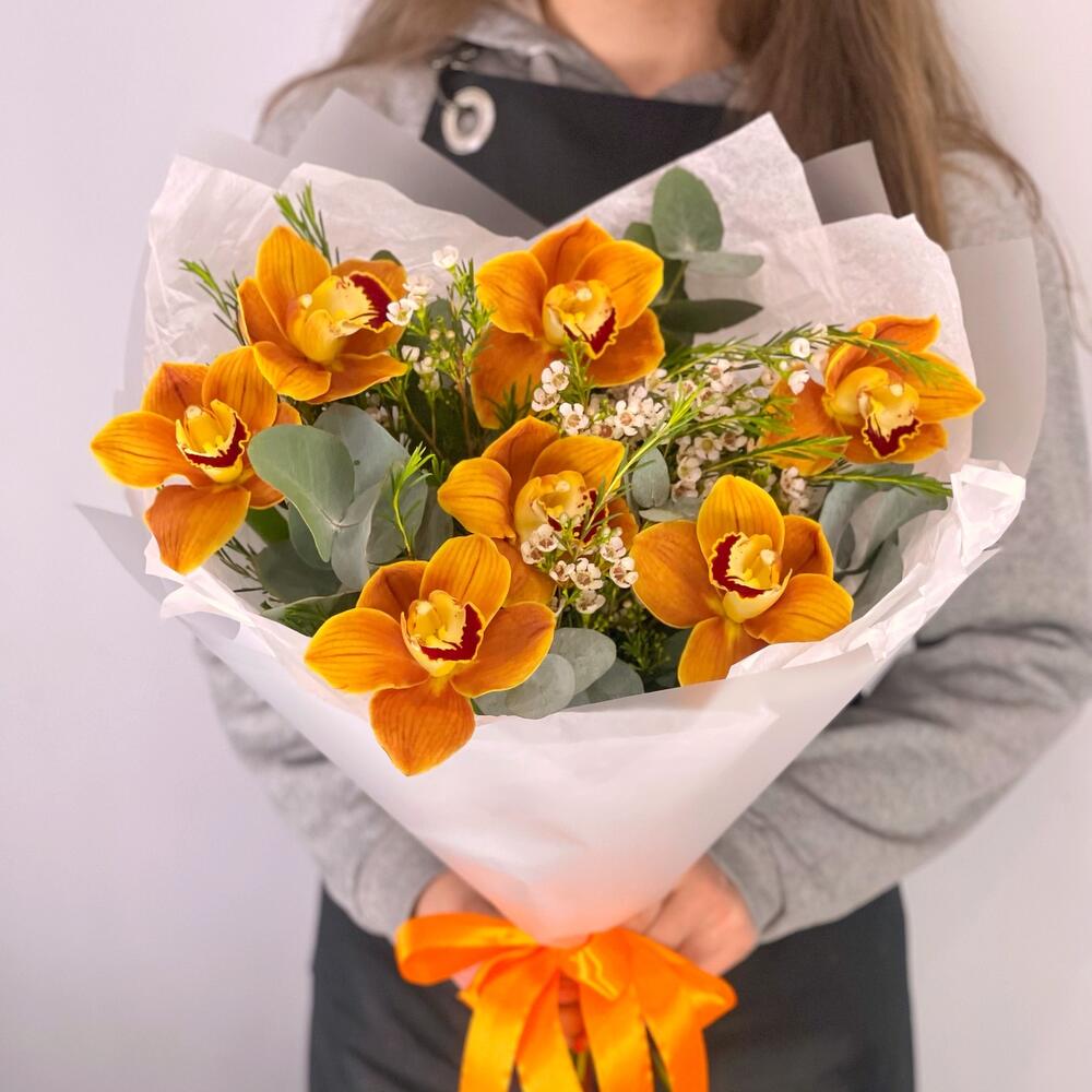 Орхидея Цимбидиум – 7 шт.Ваксфлауэр – 3 шт.Эвкалипт – 2 шт.Упаковка дизайнерская – 1 шт.