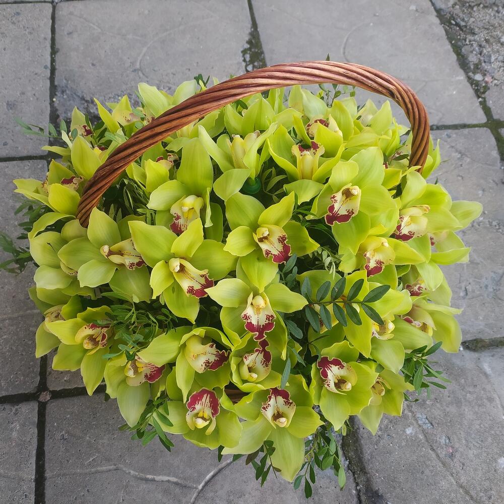 Орхидея Цимбидиум ветка – 3 шт.Корзина плетеная – 1 шт.Фисташка пучок – 1 шт.Оазис флористический – 2 шт.