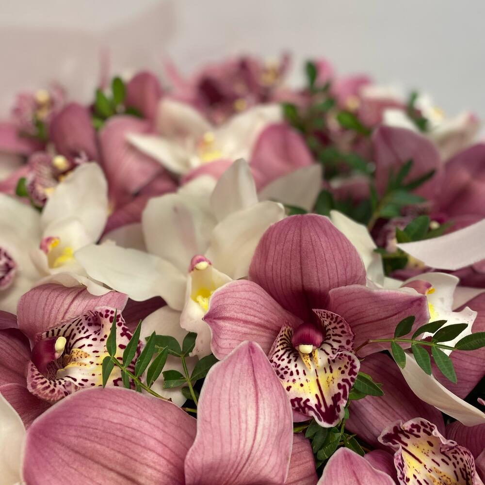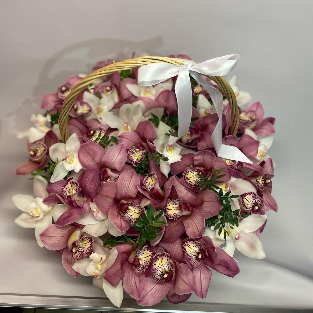 Орхидея Цимбидиум ветка – 4 шт.Оазис флористический – 3 шт.Корзина плетеная – 1 шт.