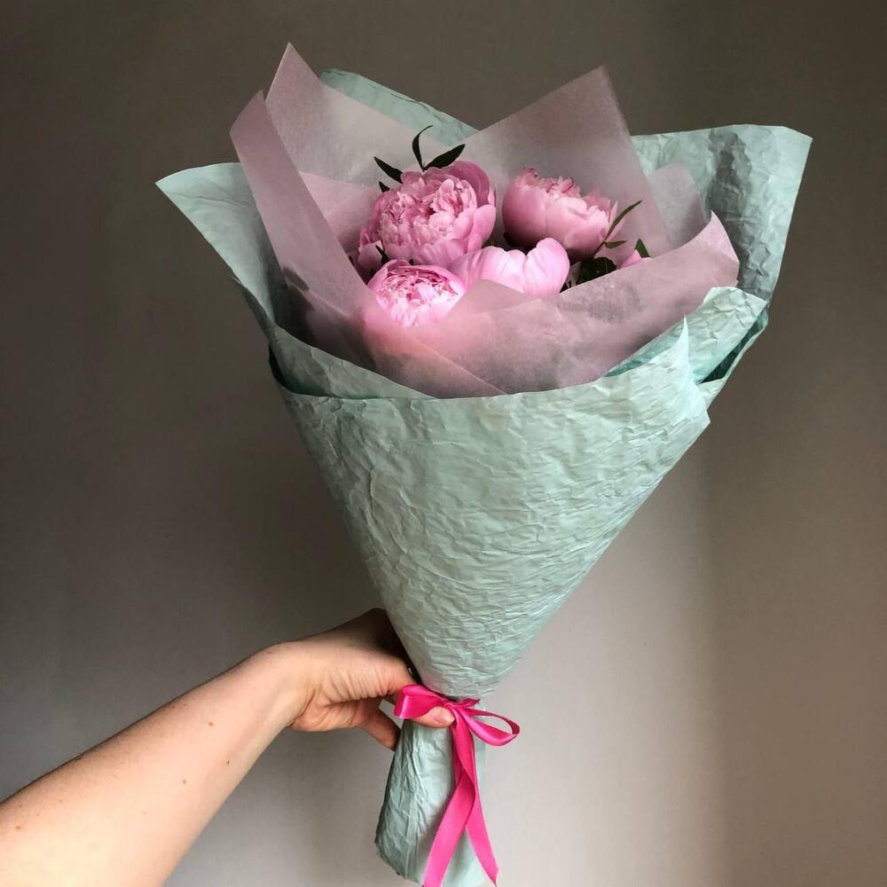 Атласная лента – 1 шт.Пион Сара Бернар – 5 шт.яркая упаковка – 2 шт.
