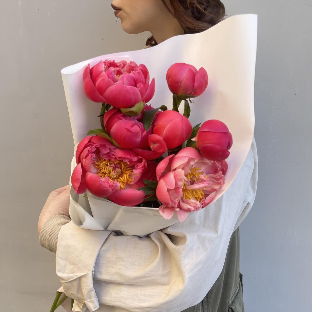 Аккуратный букет из пионов корал шарм 7 шт / 1367 id