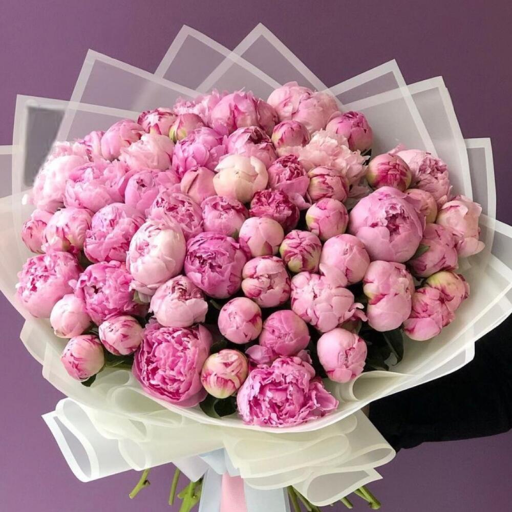 Пион Сара Бернар – 51 шт.Упаковка дизайнерская – 2 шт.Лента атласная – 2 шт.Открыточка с вашими пожеланиями – 1 шт.хорошее настроение – 100 шт.инструкция по уходу за цветами – 1 шт.коробка переноска – 1 шт.Кризал – 1 шт.