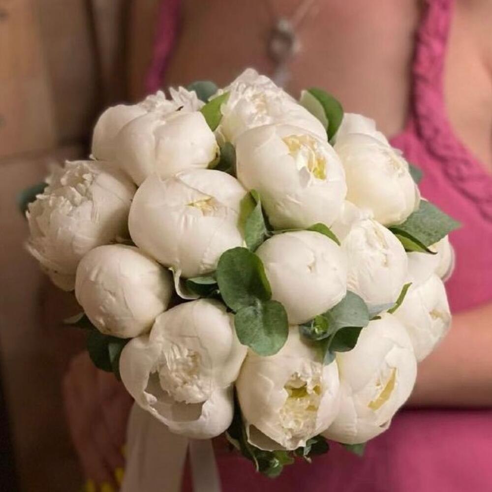 Пион белый – 13 шт.Упаковка дизайнерская – 1 шт.Лента атласная – 2 шт.Открыточка с вашими пожеланиями – 1 шт.хорошее настроение – 100 шт.инструкция по уходу за цветами – 1 шт.коробка переноска – 1 шт.Кризал – 1 шт.Эвкалипт – 10 шт.