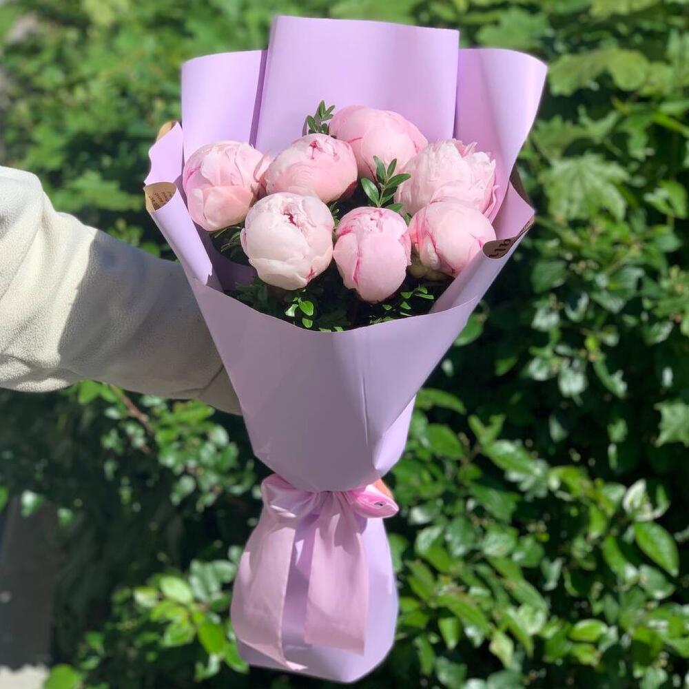 Букет розовых пионов в дизайнерской упаковке 7 шт