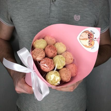 орхидея шоколадная – 1 шт.розы шоколадные – 12 шт.пионы шоколадные – 5 шт.ягоды шоколад – 7 шт.Коробка шляпная – 1 шт.пенопласт подставка – 1 шт.Прозрачная пленка – 1 шт.Лента атласная – 1 шт.