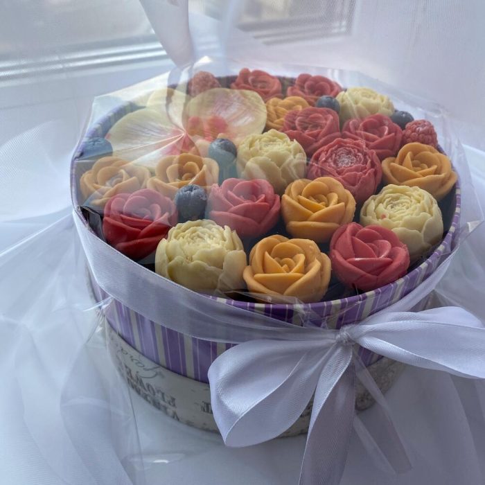 “Атлас☁️” – цветочная композиция с зефиром в деревянном ящике