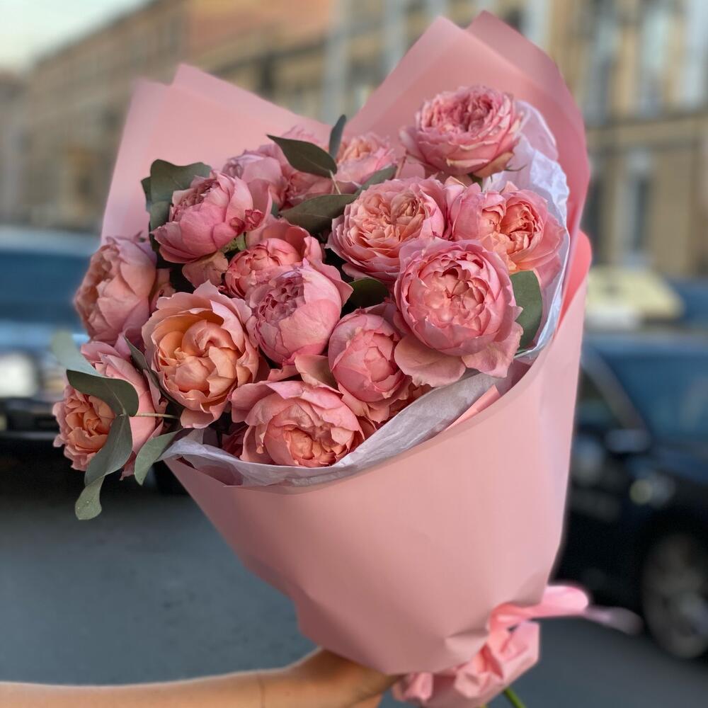 Объёмный букет с пионовидными розами, лизиантусом, озотамнусом, маттиолой и эвкалиптом