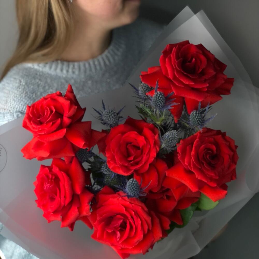 Эрингиум – 3 шт.Роза Эквадор – 7 шт.Упаковка дизайнерская – 1 шт.подкормка для срезанных цветов – 1 шт.инструкция по уходу за цветами – 1 шт.любовь флориста – 100 шт.записка с вашим текстом – 1 шт.шоколадный медиант ручной работы – 1 шт.
