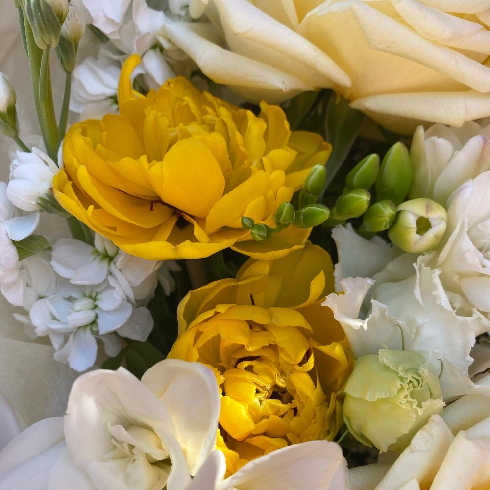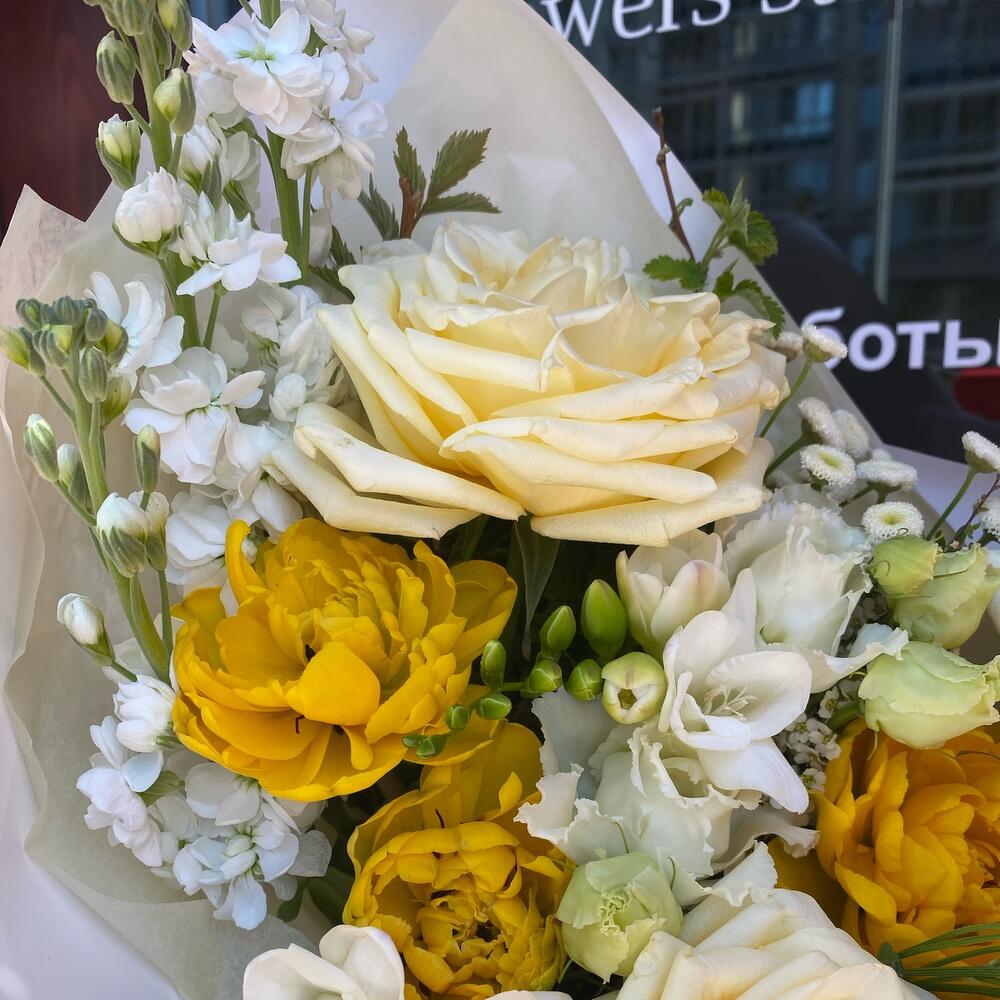 кэндллайт роза – 3 шт.Маттиола – 3 шт.Фрезия – 2 шт.эустома алиса вайт – 1 шт.матрикарья – 2 шт.Тюльпан пионовидный – 3 шт.ветви малины – 3 шт.спирея ветка – 2 шт.Упаковка дизайнерская – 3 шт.Лента атласная – 1 шт.